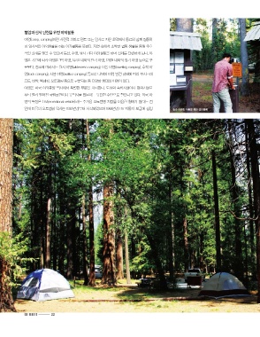 글로벌 트렌드 미국 숲속 야영장 미국 숲속 야영장, 숲속 힐링을 위한 잠자리 올 초 산림문화·휴양에 관한 법률 개정에 따라 숲속 야영장 조성에 대한 법적 근거가 마련되었다. 향후 산림 내 야영장 조성이 활발해 질 것으로 예상되며 그 어느때 보다 건전한 야영문화 조성이 필요한 시점이다. 자연과 조화를 이루며 다양한 야외 활동을 하는 미국의 숲속 야영장을 소개한다. 글+사진 유리화 국립산림과학원 임업연구관 21
