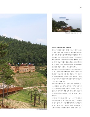 56 Sec3• 풍요로운 숲 국립진도자연휴양림 숲, ‘가을ʼ을 그리다 글+사진 편집실 ‘명량대첩’의 기개를 고스란히 품다 동백나무와 후박나무 등 143만㎡에 달하는 난대 림숲에 '명량대첩'의 역사와 문화를 담은 국립진도 자연휴양림. 바다 저 멀리 해무 사이로 언뜻 보이 는 섬들을 바라보며 420년 전 진도 인근 울돌목에 서 벌어진 명량대첩을 떠올린다. 이곳만의 특별한 힐링의 시간이다.