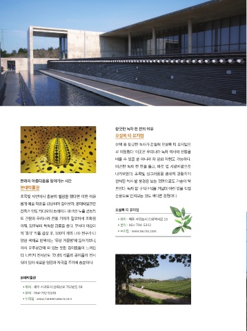본태박물관 트인다. 녹차 밭 구석구석을 거닐며 여린 잎을 직접 ● 위치 : 제주시 한경면 신창리 1481-23 ● 위치 : 제주시 구좌읍 종달리 인근