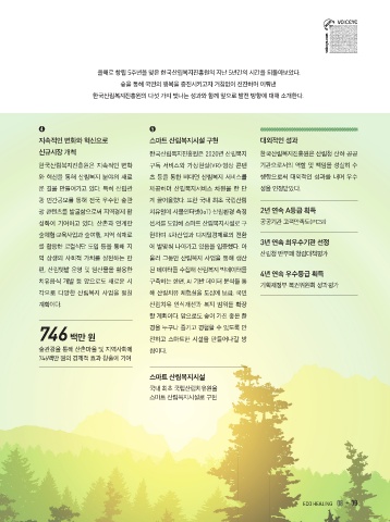 그램을 개발・운영함으로써, 가꾸고 보 의료기관 실외에 나눔숲을 조성하고, 다. 앞으로도 산림복지전문업 제도를 활 성화에 기여하고 있다. 산촌과 연계한 센서를 도입해 스마트 산림복지시설로 구 공공기관 고객만족도(PCSI)