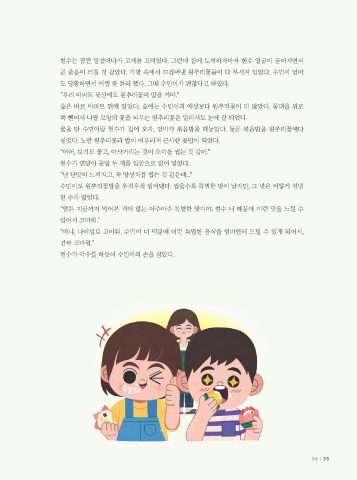 꽃을 딴 수민이랑 현수가 집에 오자, 엄마가 볶음밥을 해놓았다. 둘은 볶음밥을 원추리꽃에다
