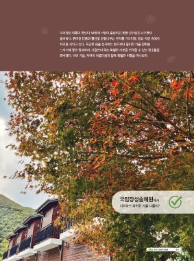 무더웠던 여름이 끝났다. 바람에 낙엽이 흩날리고 옷을 갈아입은 나무들이 즐비하다. 붉어진 단풍과 황금빛 은행나무는 우리를 기다리듯, 항상 자연 속에서 자리를 지키고 있다. 포근한 쉼을 선사하는 청도부터 짙어진 가을 정취를 느끼기에 좋은 장성까지. 가을만이 주는 특별한 기분을 만끽할 수 있는 장소들을 준비했다. 이번 가을, 자연의 아름다움과 함께 특별한 여행을 떠나보자. 국립장성숲체원에서 시작하는 화려한 가을 나들이? 35