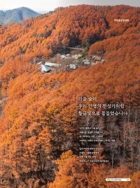국립횡성숲체원 가을 숲이 우리 인생의 전성기처럼 황금빛으로 물들었습니다 시간이 빚어낸 가을 숲이 아름다운 결실로 가득합니다 바스락거리는 낙엽 소리마저 사랑하는 사람의 속삭임처럼 느껴지는 계절 삶의 여유와 평화가 차오르는 인생의 가을을 환영하며, 푸른 가을 하늘 아래 햇살 머금은 숲을 마음껏 즐겨보세요 05