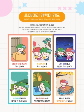 포이/마리 캐릭터 카드 완연한 가을 숲속에서 만드는 우리들의 추억 따뜻한 온열 반신욕 향긋한 꽃차를 청사초롱 들고 하고 싶포이 마시고 싶포이 밤산책 하고 싶포이 ney with nature... 반려동물과 함께 통나무 위에 누워 물소리 들으며 숲속을 누비고 싶포이 치유명상 하고 싶포이 풍류를 즐기고 싶포이