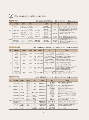 국립산림치유원 •위치: 경북 영주시 봉현면 테라피로 209 •문의: 054-639-3400 •누리집: daslim.fowi.or.kr 국립횡성숲체원 •위치: 강원 횡성군 둔내면 청태산로 777 •문의: 033-340-6300 •누리집: hoengseong.fowi.or.kr
