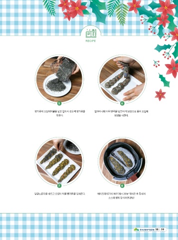 RECIPE 5 6 빵가루에 오징어먹물을 넣고 갈아서 검은색 빵가루를 짤주머니에 어묵 반죽을 넣고 더덕 모양으로 종이 포일에 만든다. 모양을 내준다. 7 8 달걀노른자를 바르고 오징어 먹물 빵가루를 입혀준다. 에어프라이기에 180℃에서 20분 익혀준 후 접시에 소스와 함께 장식하면 완성! 38ㅣ 39