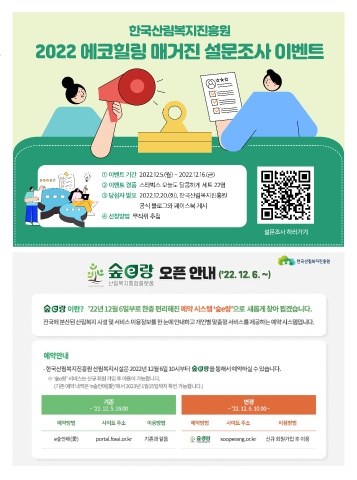 한국산림복지진흥원 2022 에코힐링 매거진 설문조사 이벤트 ① 이벤트 기간 2022.12.5.(월) ~ 2022.12.16.(금) ② 이벤트 경품 스타벅스 오늘도 달콤하게 세트 22명 ③ 당첨자 발표 2022.12.20.(화), 한국산림복지진흥원 공식 블로그와 페이스북 게시 ④ 선정방법 무작위 추첨 설문조사 하러가기