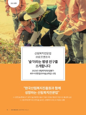숲속 사람들 산림복지전문업 ㈜로프앤조이 ‘숲’이라는 평생 친구를 소개합니다 2023년 산림복지전문업평가 최우수전문업(유아숲교육업) 선정 “한국산림복지진흥원과 함께 성장하는 산림복지전문업” ◦ 전문업을 통해 장기 일자리를 제공함으로써 고용의 안정성 향상과 민간시장 활성화 도모 ◦ 산림복지전문가의 전문성을 높이고, 산림복지서비스의 다양성 강화 1 6 ECO HEALING 2024 SPRING VOL_42