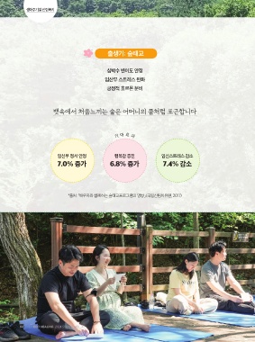생애주기별 산립복지 출생기: 숲태교 심박수 변이도 안정 임산부 스트레스 완화 긍정적 호르몬 분비 뱃속에서 처음느끼는 숲은 어머니의 품처럼 포근합니다 임신부 정서 안정 기대효과 임신스트레스 감소 7.0% 증가 행복감 증진 7.4% 감소 6.8% 증가 *출처: 「배우자와 함께하는 숲태교프로그램의 영향」 (국립산림치유원, 2017) 0 6 ECO HEALING 2024 SPRING VOL_42
